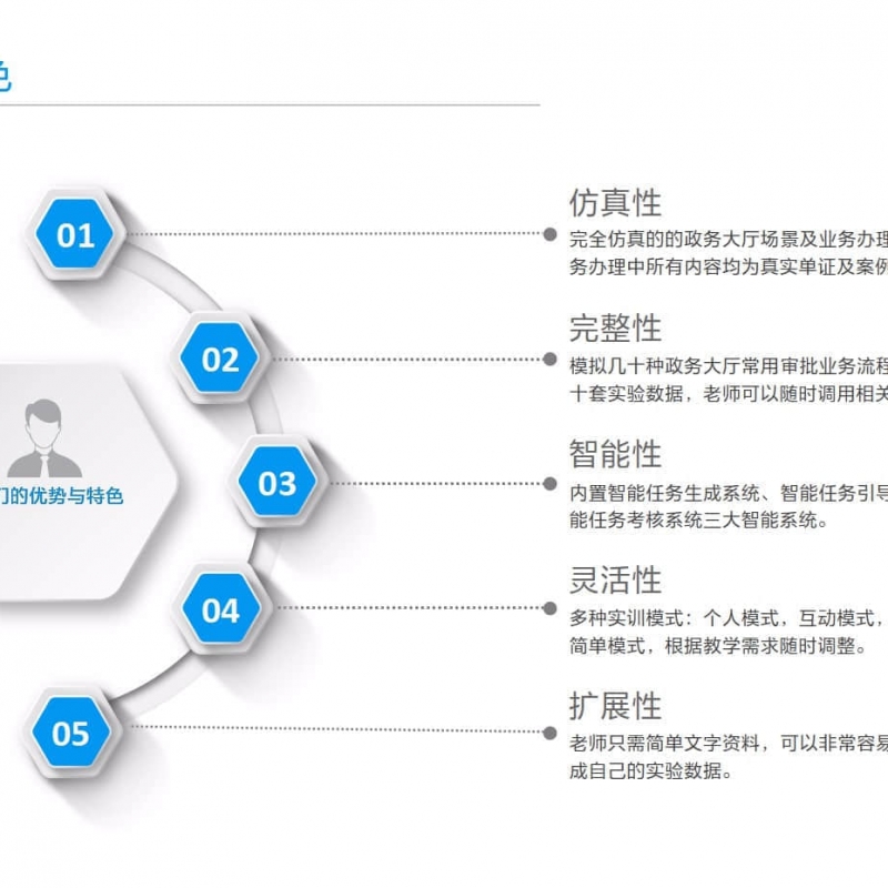 行政集中化审批智能实训软件 软件简介行政集中化审批智能实训软件仿真模拟最新的国家市级政务大厅功能为基础,包含行政服务中心模块和网上政务大厅模块融合最新学校电子政务教学要求,结合国家相关政府政务大厅文件要求,真实模拟了市级行政服务中心、网上政务大厅、市民、法人、政务大厅安全保障部门等角色,选取政府各部门中最典型的几十种办事项目,让学生真实模拟相关政府线下/网上办事的各项流程。 本软件符合国家针对政府政务大厅 “一口受理”、“限时办理”、“规范办理”、“透明办理”和“网上办理”的要求,真实模拟国家现阶段政务大厅相关业务办理流程。结合学校老师教学实验的的真实需求,加入大量实训所需数据及案例,经过详细的需求分析,形成了适应高校社保业务教学的软件产品。具有交互性强、逼真性高、动态灵活、功能强大、易于使用的特点。 详细信息